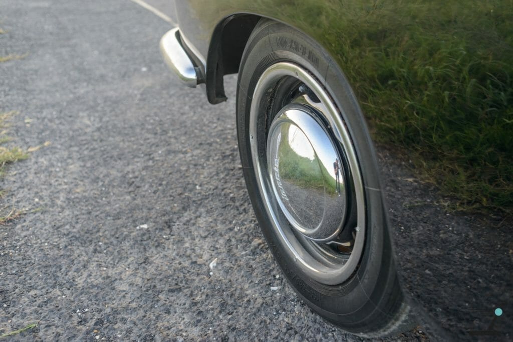 Die Räder sind original Einheiten mit farblich abgestimmten Stahl mit Chrom-Radkappen und Zierringe ausgestattet. Da sie original Stücke sind, gibt es ein paar leichte Dellen und Unvollkommenheiten in den Zierringen aus Jahrzehnten der Reifenwechsel über das Leben des Autos. Reifen sind vor kurzem ersetzt, sondern sind eine Zeit-korrekte Michelin-Design und Größe angemessen für das Auto.
