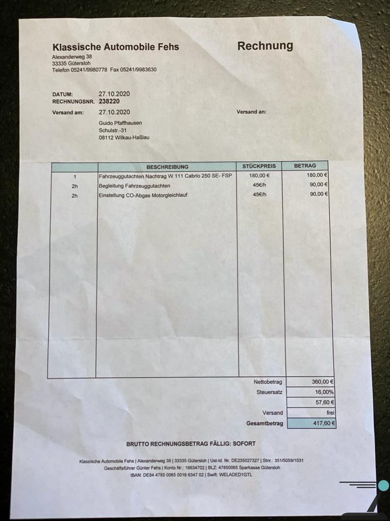 Seit der Wagen in meinem Besitz ist, wurden im Mercedes-Classic-Centrum Essen neue Automatik-Sicherheitsgurte nachgerüstet und der Wagen einer kompletten Revision mit Austausch der Einspritzdüsen und Erneuerung der Bremsanlage unterzogen.