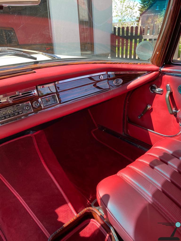 Der 250SE ist das letzte Mercedes Modell welches über die berühmte, mit hohem handwerklichem Aufwand in der Werkstischlerei hergestellte Edelholz- Tachoabdeckung verfügt. Bei meinemAuto sind alle Holzteile in perfektem Zustand. Auf der rechten Seite unten an der Windschutzscheibe ist ein kleiner Teil milchig.