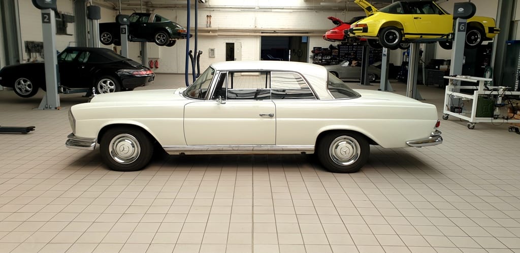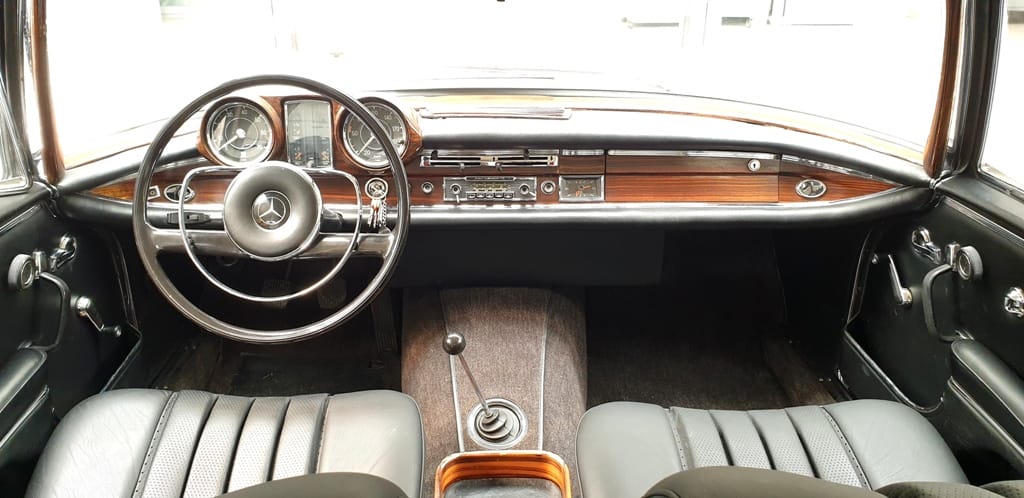 Dieses schöne W111 Coupé wurde “leicht restauriert” und trägt noch ein wenig von seiner authentischen und gut erhaltenen Patina. Das Interieur wurde neu aufgepolstert und alle Funktionen überprüft. Die Fenster wurden ausgebaut, um den Wagen neu zu lackieren. Die Neulackierung zeigt eine gute Qualität. Die ganze Technik von Fahrwerk, Motor, Achsen, Lenkung, Bremsen, etc. wurden komplett gewartet und funktionieren einwandfrei. Die Hohlräume wurden ausreichend abgedichtet. Der Motor springt sofort an und das Schaltgetriebe schaltet sanft und direkt.