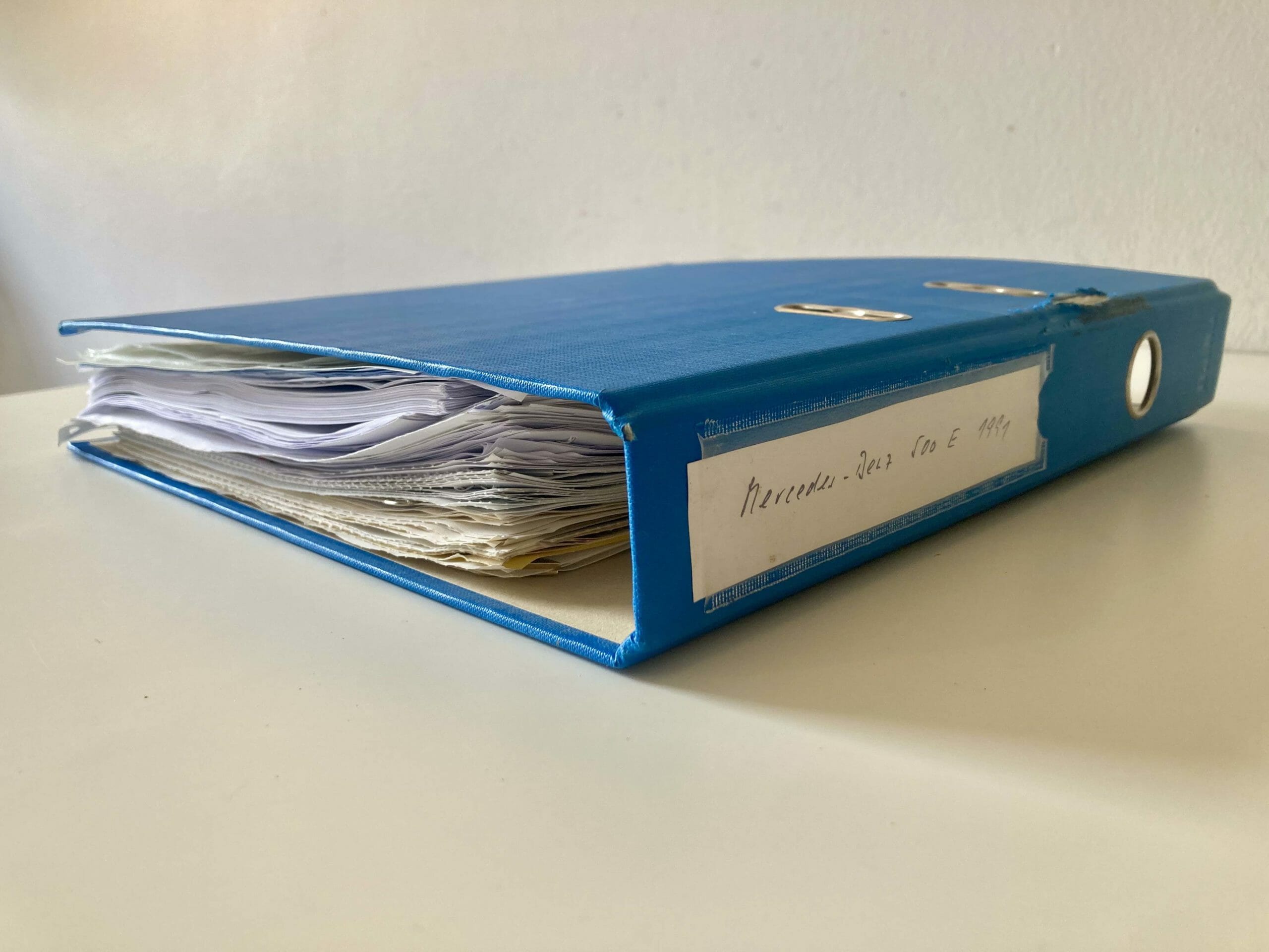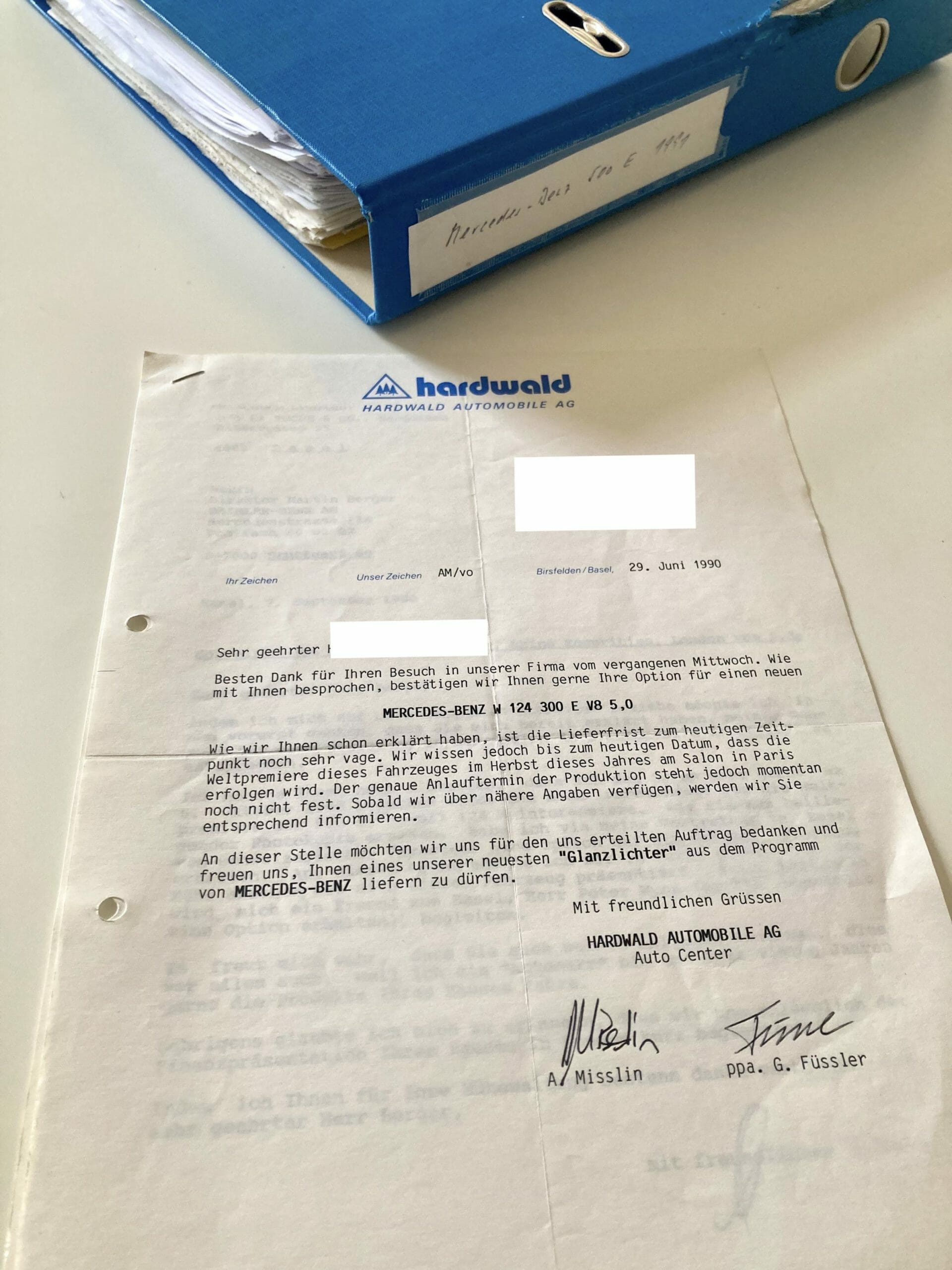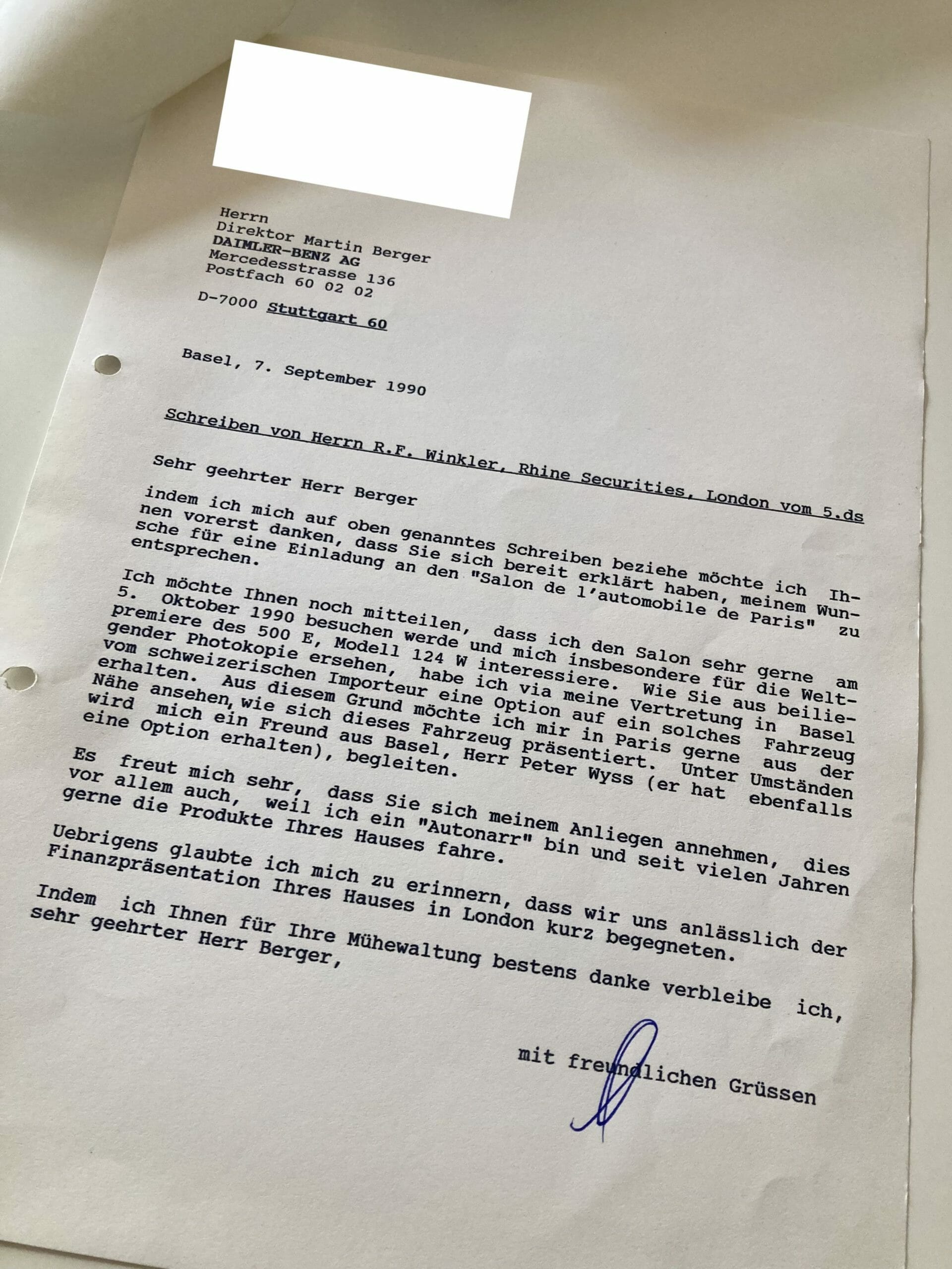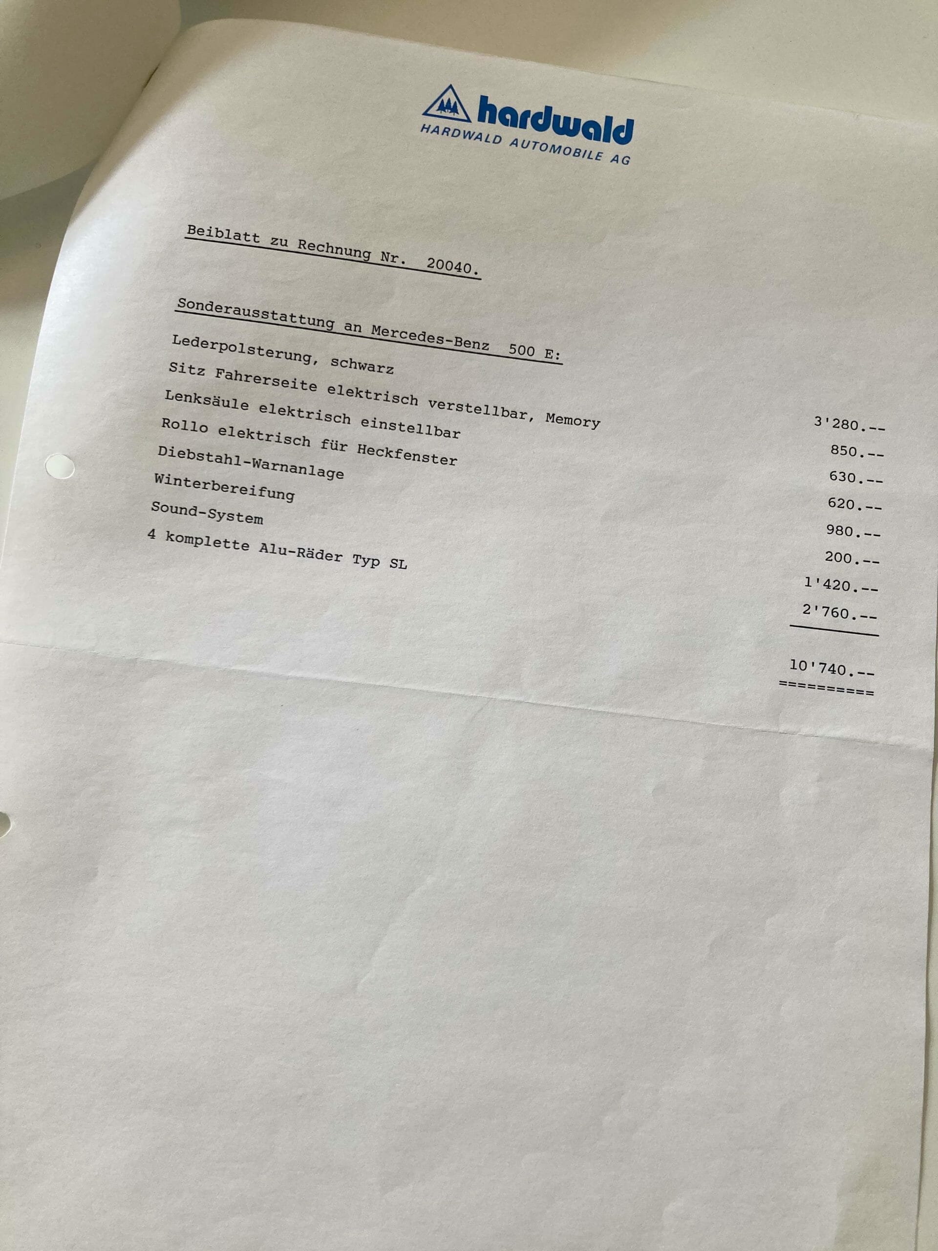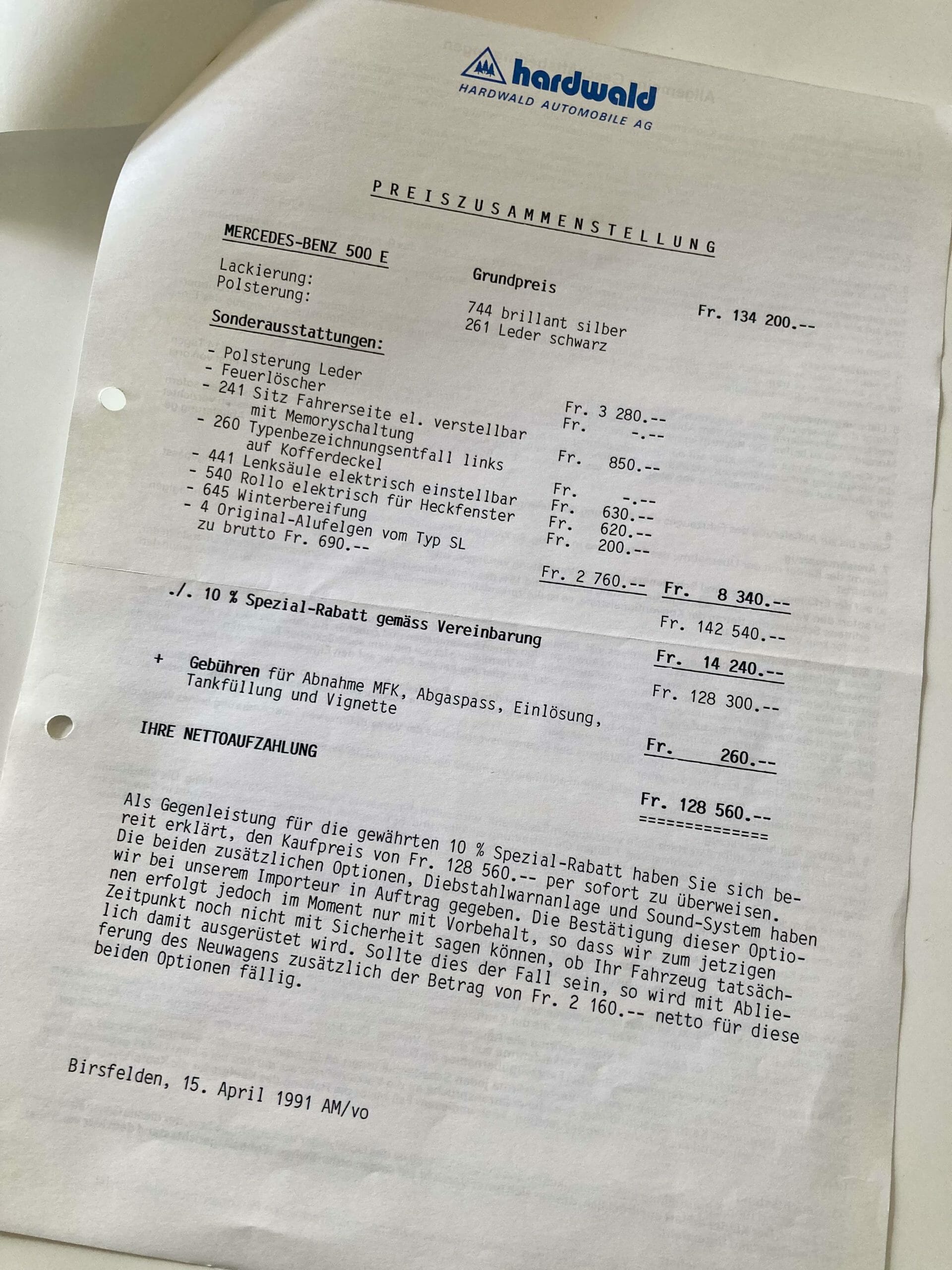 Die komplette Fahrzeuggeschichte inklusive des ersten Kaufantrags und einer Einladung zum “Salon de làutomobile de Paris 1990” des ehemaligen Daimler Benz AG Direktors Martin Berger ist vorhanden. Das Auto wurde damals für 140.000 DM gekauft (siehe Bilder)