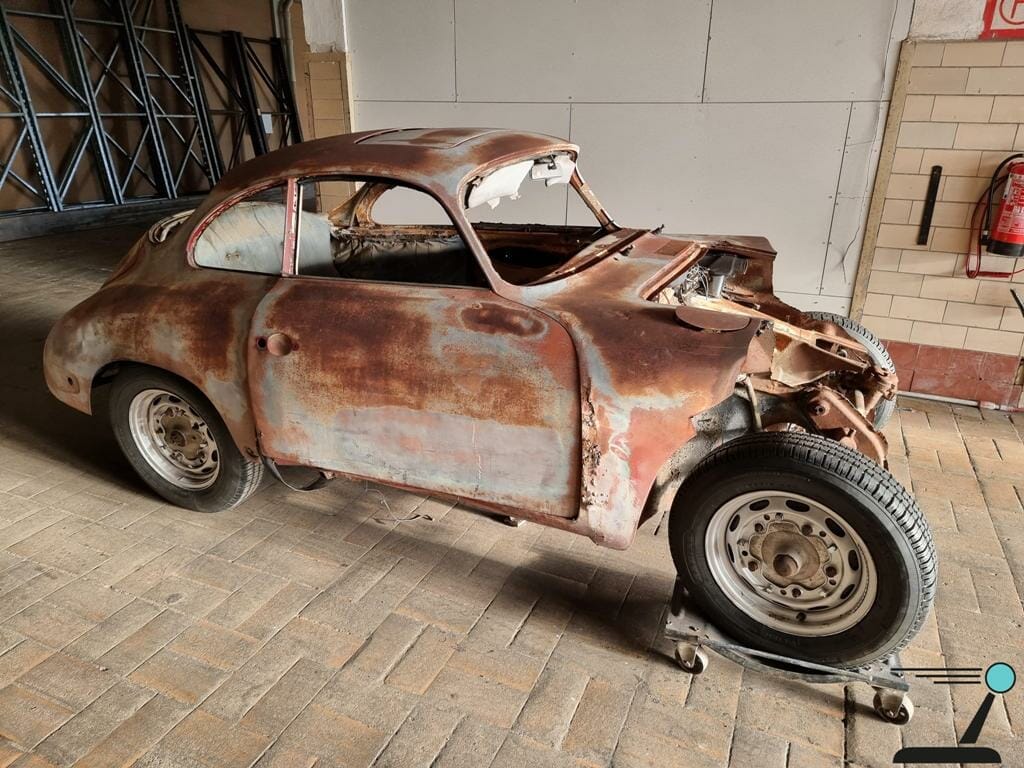 Die Frontmaske und die Böden des Kofferraums wurden aus Restaurationsgründen herausgeschnitten, weshalb die VIN in der Front fehlt. Wenn man sich die Vorderseite ansieht, sieht es so aus, als ob das Auto vorne nicht verformt ist, aber wegen des Rosts wurde die Front herausgeschnitten. Wir kennen einige professionelle 356-Restauratoren, die wissen, wie man eine neue Frontmaske wieder einbaut. Es sieht schrecklich aus, ist aber das tägliche Brot für erfahrene Fachleute. Auch die Ersatzteilversorgung bei Porsche ist hervorragend, was nicht viel Ärger verursacht. Der Beginn der Restaurierung liegt schon einige Zeit zurück.