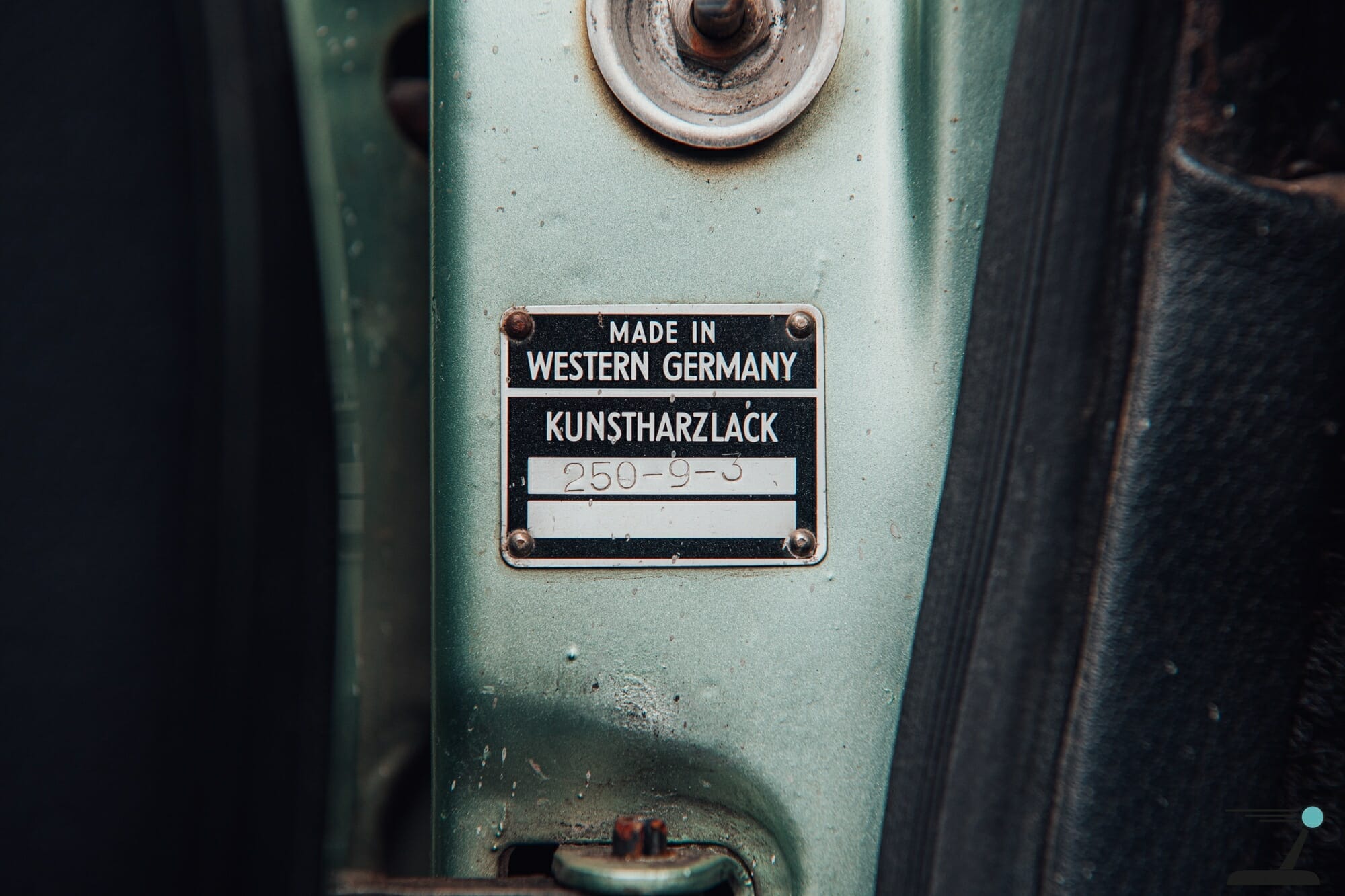 Der Wagen wurde in der Originalfarbe Silver Green Diamond Metallic neu lackiert und weist eine gleichmäßige Lackschicht auf. Geringfügige Farbunterschiede sind auf den Panels zu erkennen.