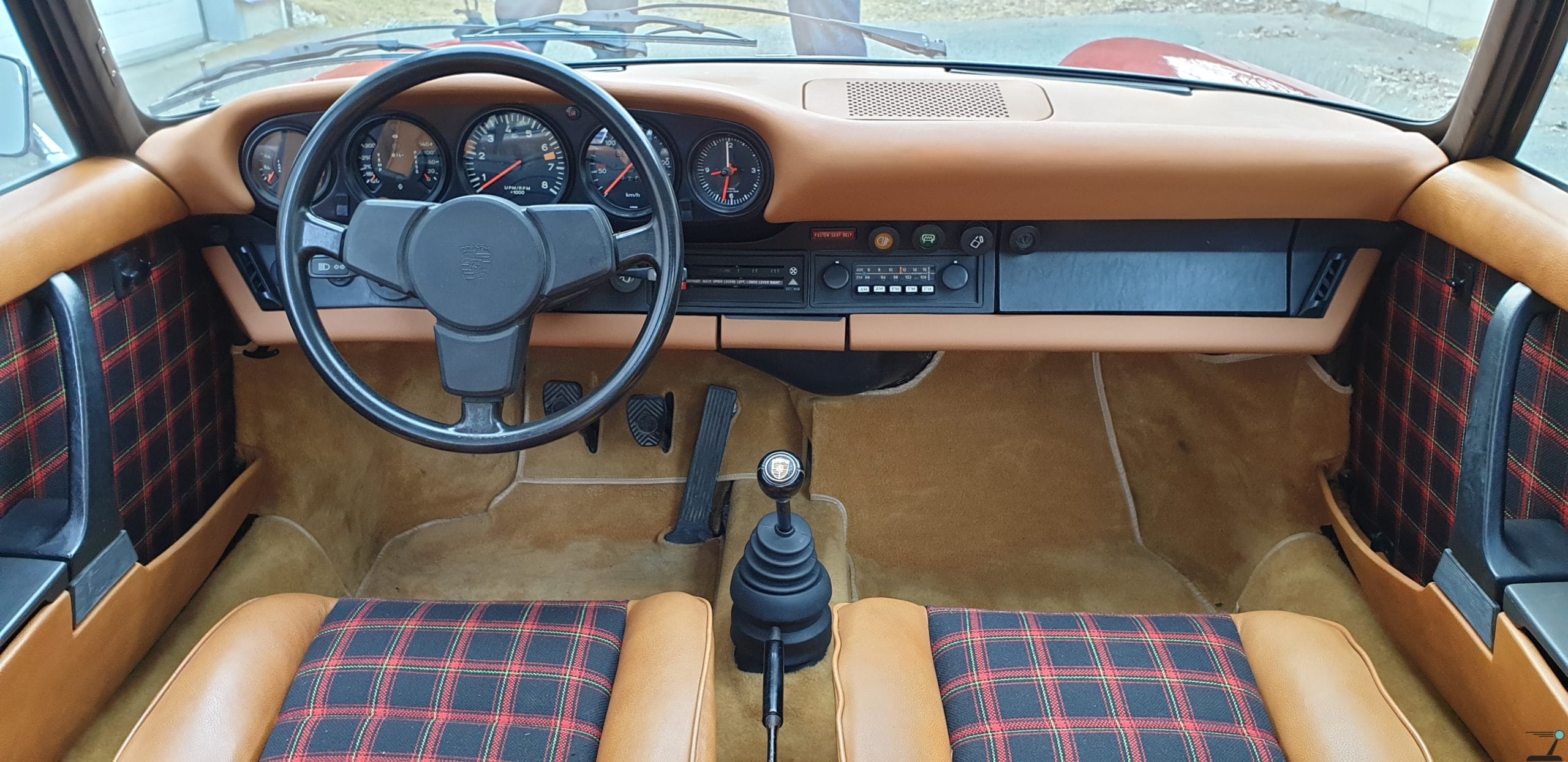 Die sehr seltene Original-Farbkombination perurot (042) mit cognacfarbener Innenausstattung zeichnen diesen 911 aus. Die Tartan-Innenausstattung unterstreicht die Einzigartigkeit, obwohl sie nicht original ist und während der Restaurierung hinzugefügt wurde. Seit der Restaurierung wurde der Wagen nur ca. 200 km gefahren.
