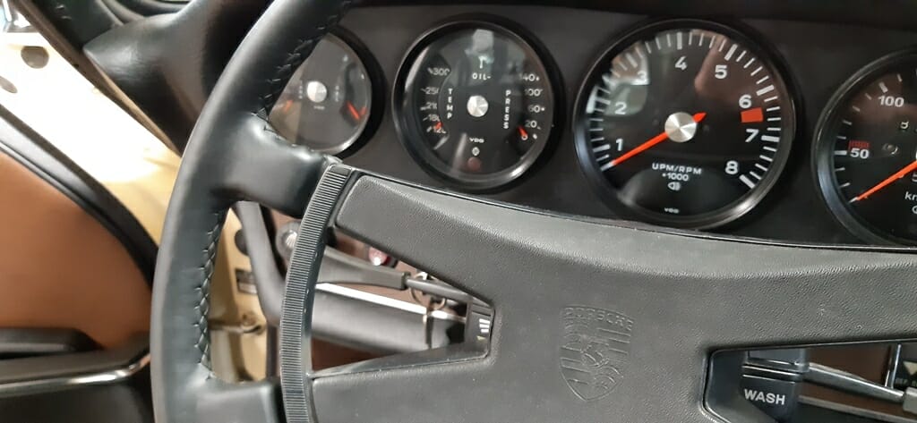 Dieser 911 zeigt sich in sehr gutem Zustand. Die Spaltmaße passen, der Motor springt sofort an und läuft ruhig, und das Getriebe macht seine Arbeit präzise. Sogar die Einspritzpumpe war eingestellt und ihr Riemen erneuert worden. Lenkung und Achsen zeigen kein Spiel, was diesen schönen 911er von den abgenutzten alten Modellen unterscheidet.