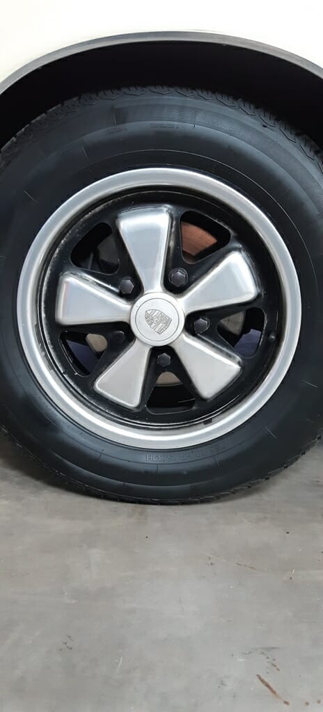 Dieser 911er ist mit H-Kennzeichen zugelassen und steht auf 5 (inkl. Reserverad) original gestempelten (11/72) unbeschädigten 6J 15″ Fuchs Felgen mit Vredestein Sprint Classic Bereifung 185/70 HR 15 89H aus 2019 mit Tüv bis März 2023.