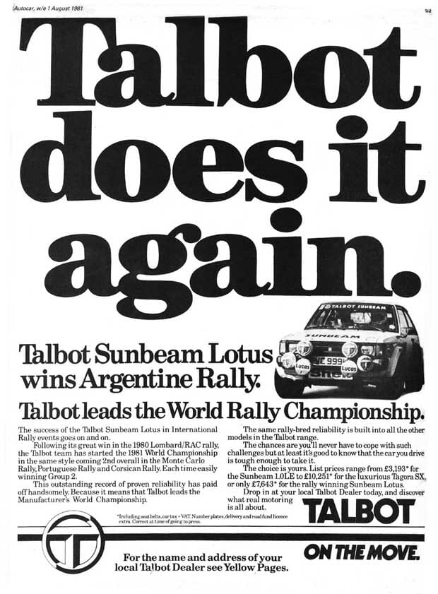1981 schnitten die Talbot-Sunbeam-Lotus-Fahrzeuge im Rallyesport sehr gut ab: 2. und 5. Platz in Monte Carlo, 2. in Portugal, 2. bei der Tour de Corse, 4. bei der Akropolis-Rallye, 1. in Argentinien, 2. in Brasilien, 2. bei der Rallye San Remo und 3. bei der Lombard-RAC-Rallye. Dies führte dazu, dass Talbot die WRC-Hersteller-Meisterschaft gewann und Guy Frequelin den zweiten Platz in der WRC-Fahrer-Meisterschaft belegte.