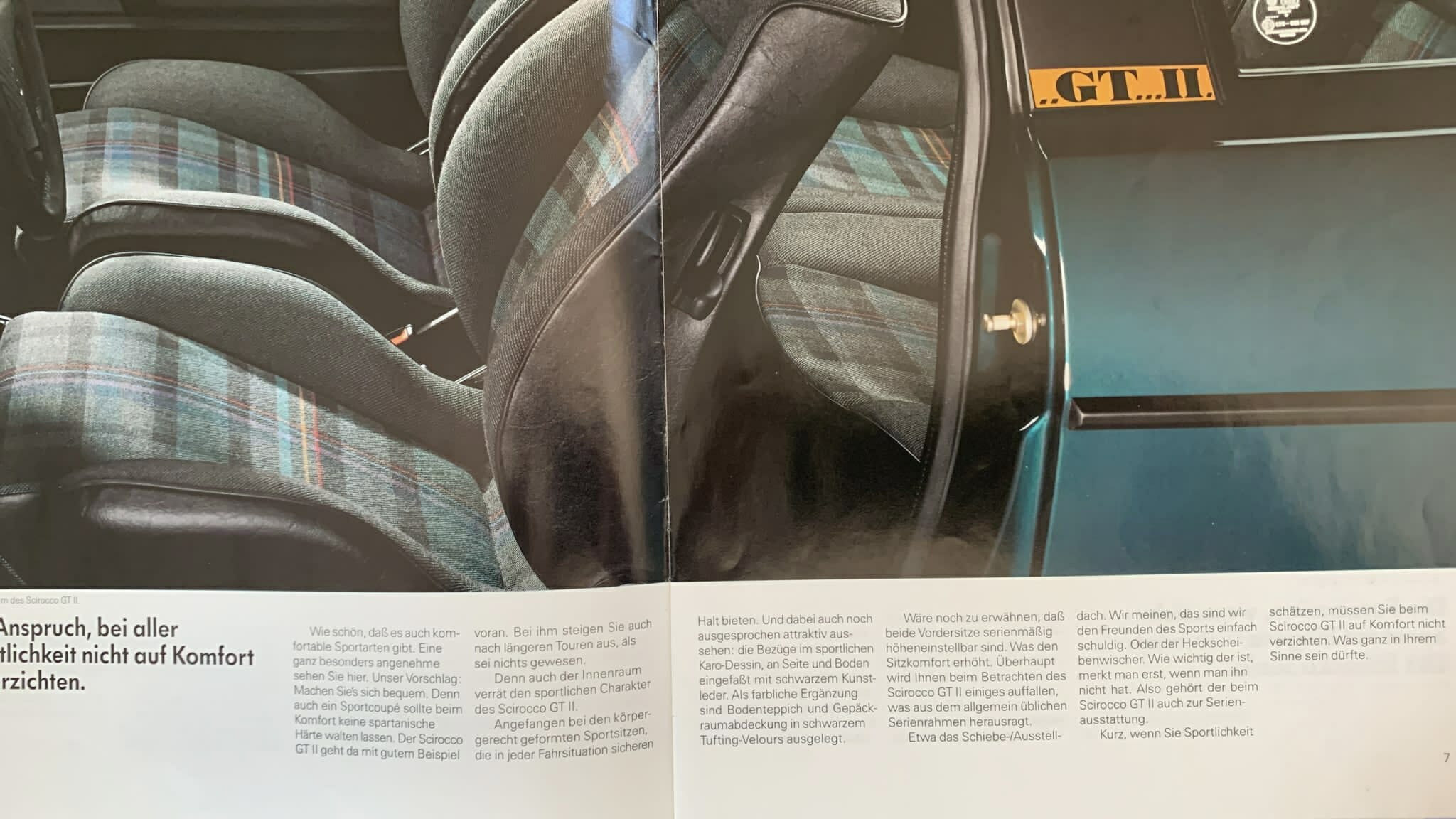Ausgeliefert wurde der Scirocco in der Farbe: grün perleffekt R 6 mit der Innenausstattung: vierfarbig kariert, wie im Originalprospekt, der dem Wagen beiliegt.