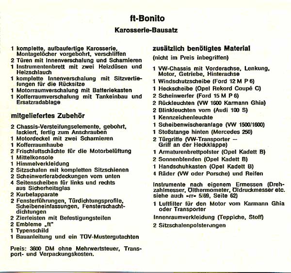 Im Jahr 1978, ein Jahr vor dem Ende der Bonito-Produktion, kostete der Bausatz 4490,00 Mark; dazu kamen noch eine Reihe von Zubehörteilen, Verpackungs- und Versandkosten sowie die Mehrwertsteuer.