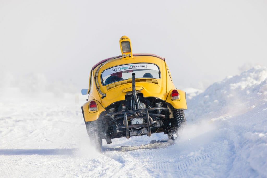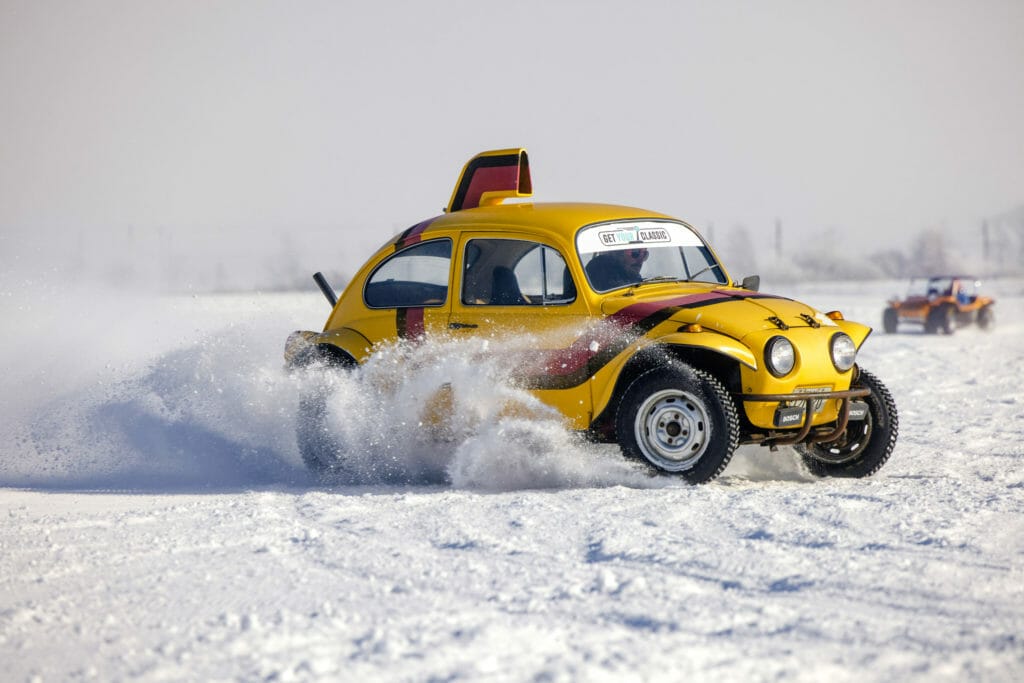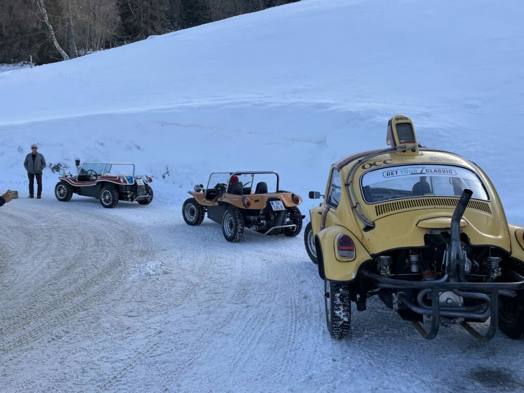 We got together with the whole Meyers Manx crew on Wednesday morning to start the fun. At this point, it wasn’t really clear when we would be able to go, but that didn’t dampen our anticipation of getting to play in the snow with the buggies and the Baja right away. 4 buggies and 2 bajas. After several COVID tests, we saw the new site that Ferdinand Porsche and his team had built. New location, new track. Unfortunately, everything was closed off and no public was allowed. We were supposed to go on the track, but since Porsche needed a perfect picture on the track with their Porsche 550 Spyders, we had to find alternatives to play around with. And there were plenty of those. Fresh snow in the area, so we went wild and tested how beach cars do on snow.